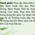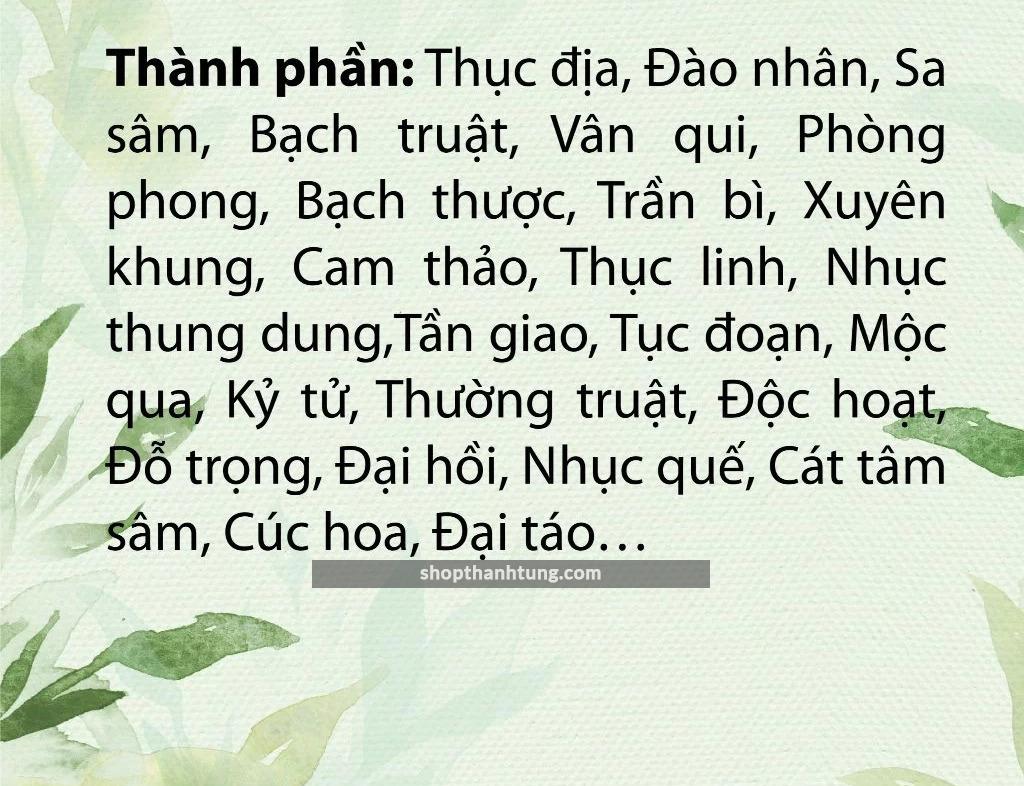 Thành phần: Thục địa, Đào nhân, Sa sâm, Bạch truật, Vân qui, Phòng phong, Bạch thược, Trần bì, Xuyên khung, Cam thảo, Thục linh, Nhục thung dung,Tần giao, Tục đoạn, Mộc qua, Kỷ tử, Thường truật, Độc hoạt, Đỗ trọng, Đại hồi, Nhục quế, Cát tâm sâm, Cúc hoa, Đại táo…