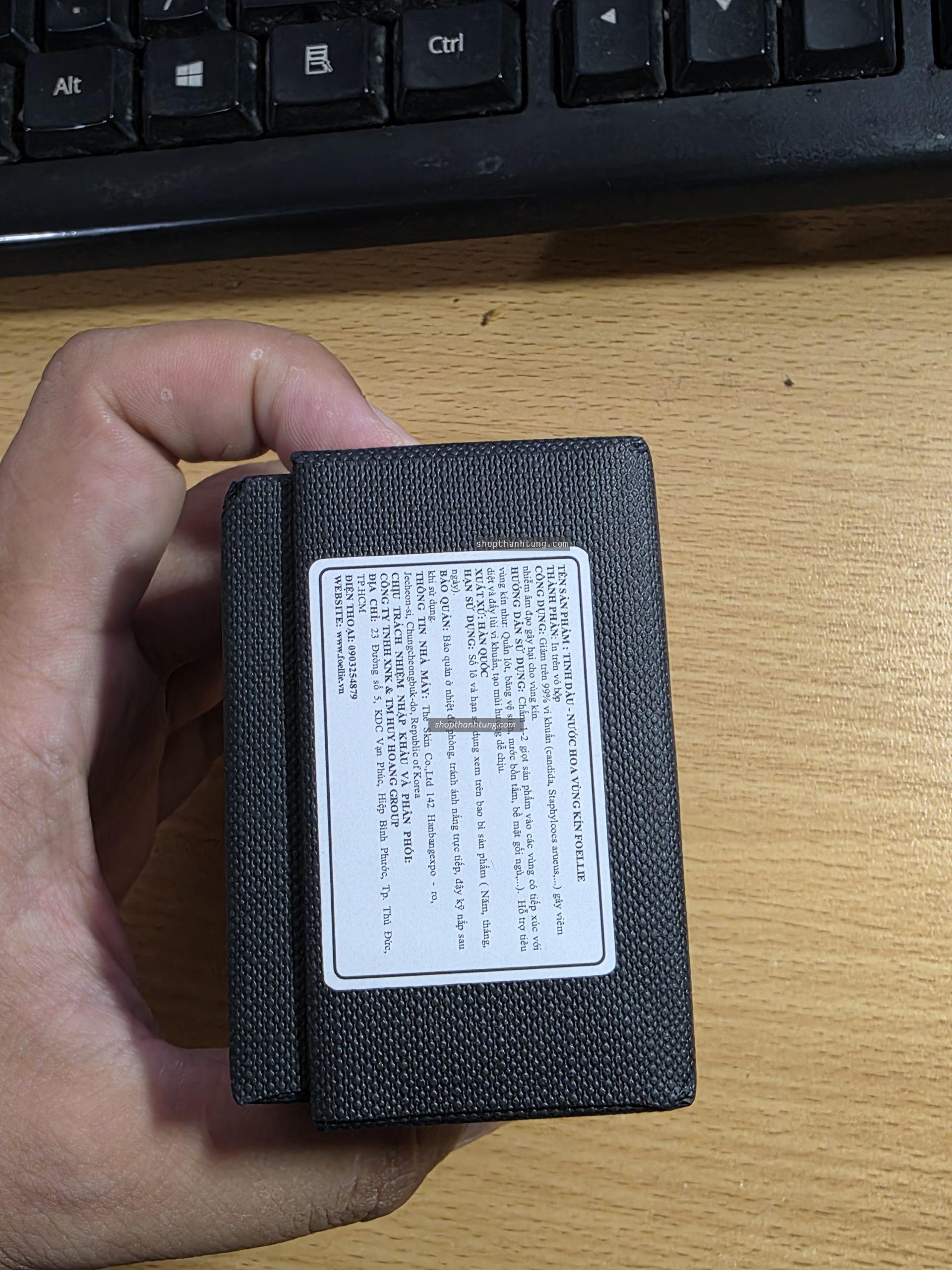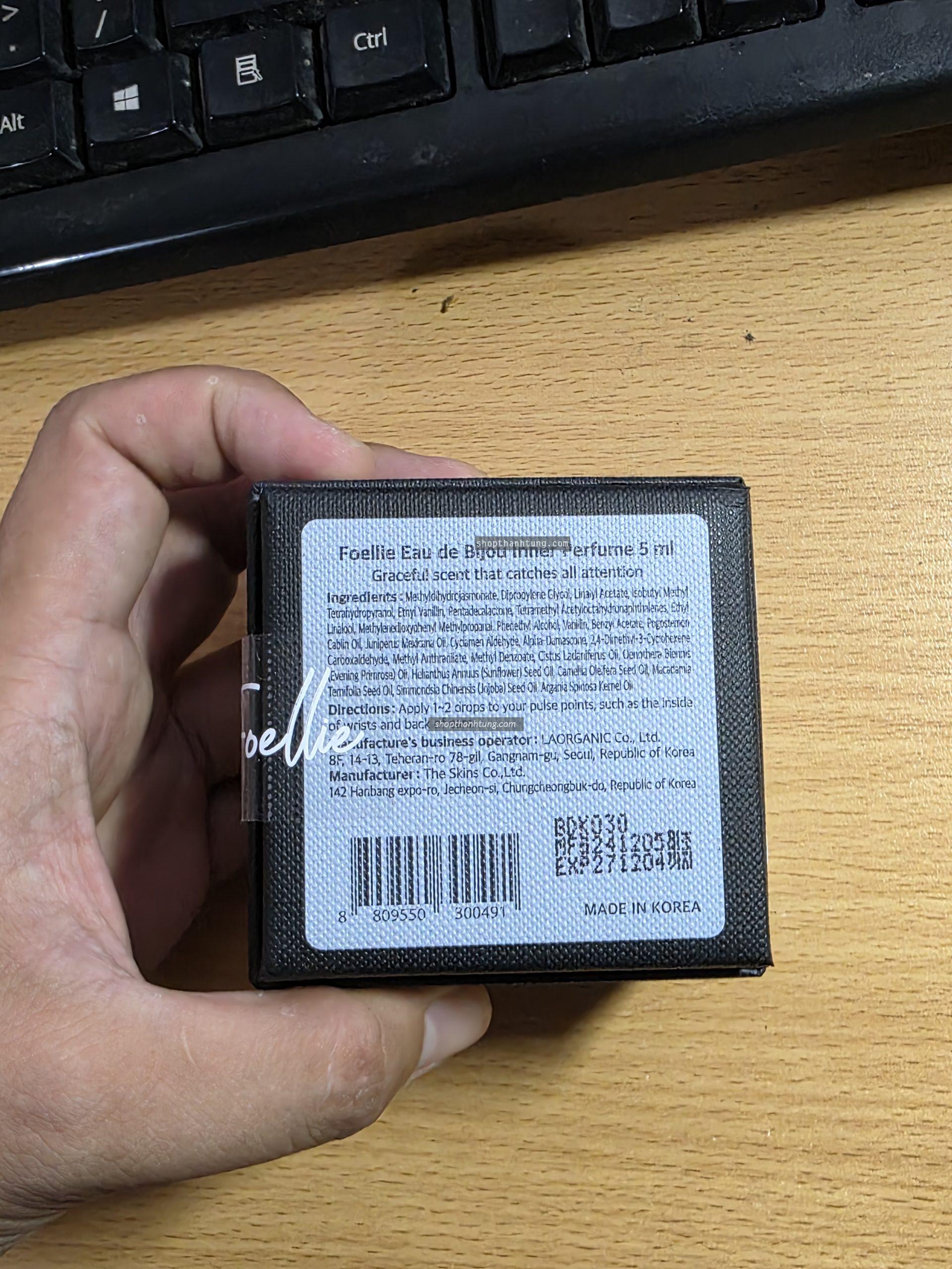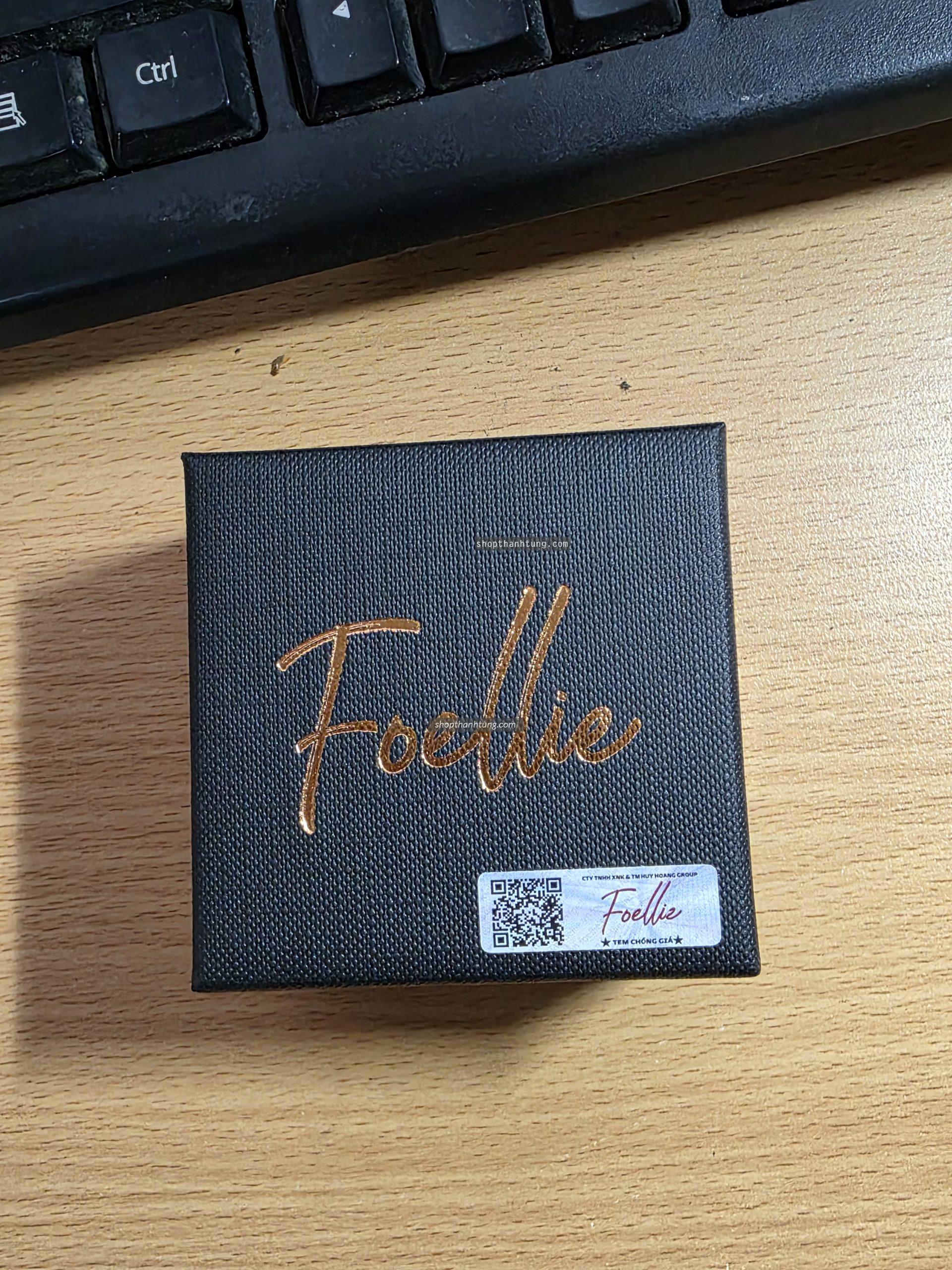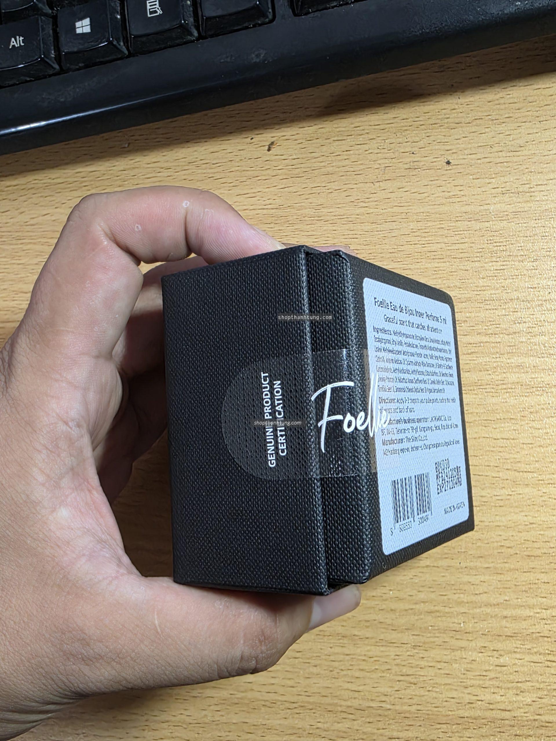 Mặt trước của sản phẩm được in tên thương hiệu Foellie đi kèm với phần giấy màu trùng với màu mùi hương của sản phẩm. Phần đầu lấy sản phẩm có phần ống nhô ra, còn ở phần bên cạnh của chai nước hoa, các bạn sẽ nhìn thấy phần logo sản phẩm, giúp chúng ta check được liệu nó có phải sản phẩm chính hãng hay không bằng phần mềm HiddenTag mà hãng đã ghi ở trên tem sản phẩm.